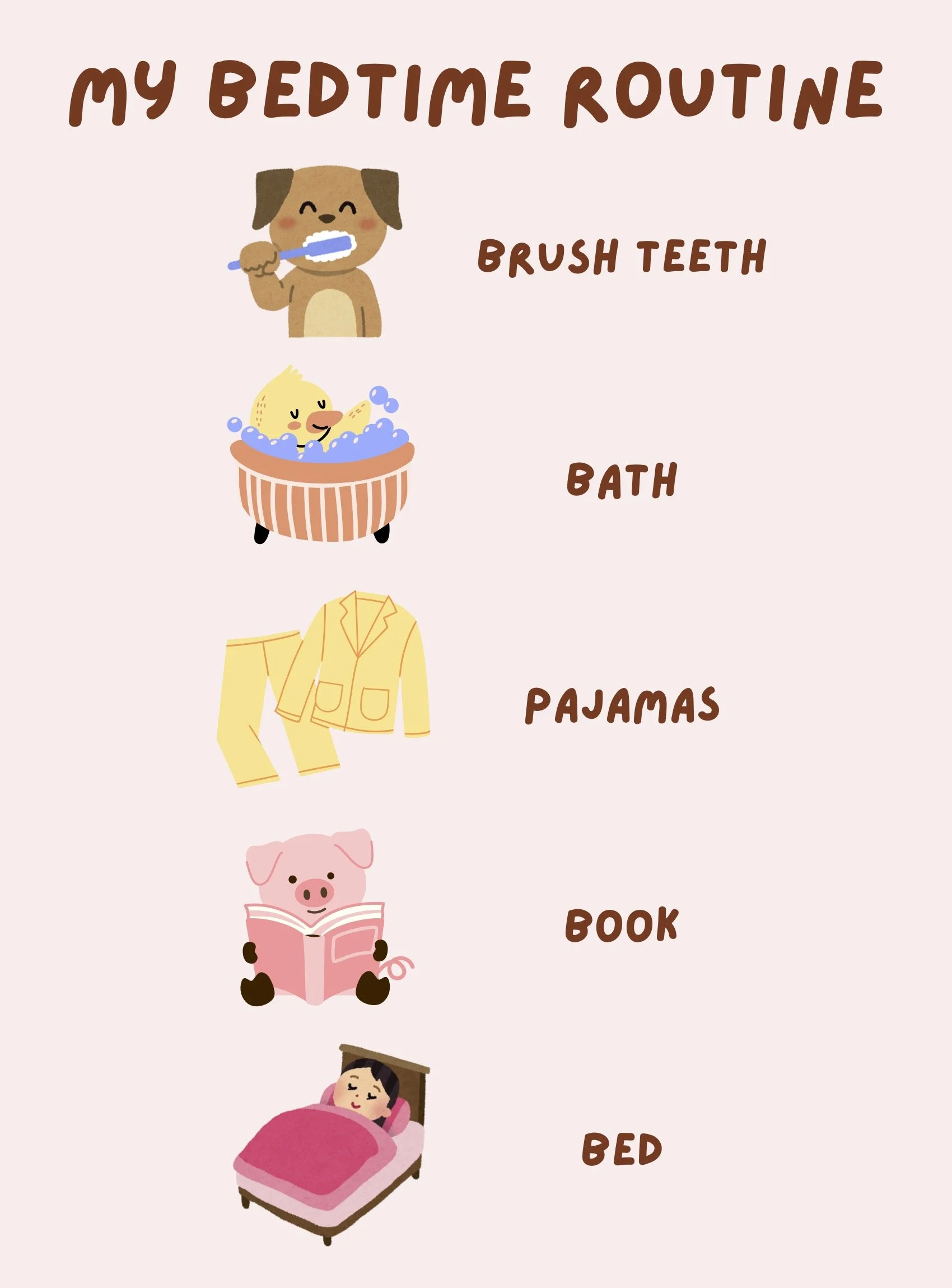 Most children do best with four to six steps, so keep the routine simple and predictable. Too many steps can lead to overwhelm and stalling.